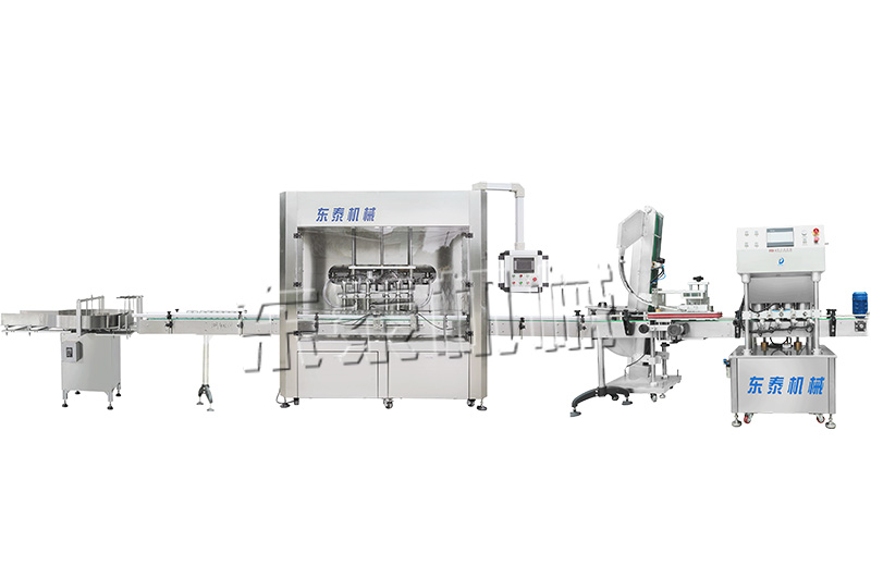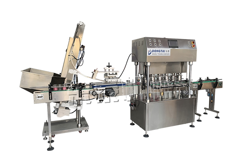 6头灌装线:圆盘供瓶机自动往输送带上供瓶—全自动灌装机自动灌装—全自动提盖机自动理盖、提盖、挂盖—四头真空旋盖机同时四个头真空旋盖—全自动不干胶贴标机自动对圆瓶进行不干胶贴标——激光喷码机自动刻码—不锈钢整理平台人工装箱—机器自动纸箱封箱;