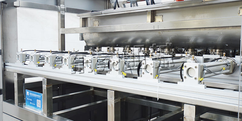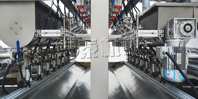B、该灌装机酱料灌装系统有16个灌装头,16个亚德客气缸驱动,16套酱料特殊定做转阀,采用横推料的方式,大大缩短了下料斗到灌装头的距离,提高了灌装速度,更重要的是解决了含油量大的物料在灌装过程中出现的有些瓶油多,有些瓶酱多的灌装难题,大大提高了灌装精度。
