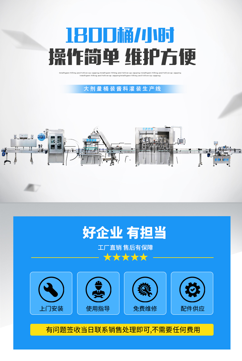 酱料灌装机生产线采用活塞式伺服系统驱动原理,适用于粘流体中带小颗粒并且可流动的较为粘稠的物料灌装。比如:洗衣液、洗洁精、甜面酱、沙拉酱、芝麻酱、食用油等的灌装。设备采用伺服系统定量推料,在人机界面数字化调节计量,并且可设定所需计量,触摸屏一触即达,而且可以单头微调计量。操作简单,维护方便,节省人工成本,生产效率更高。